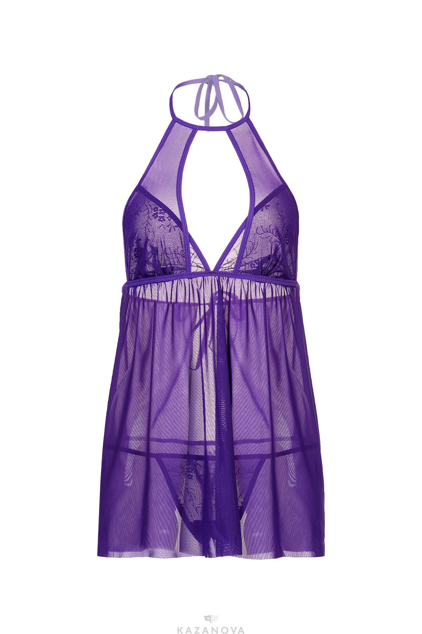 Комбинация сделана из полупрозрачной ткани. Сорочка фиксируется на шее завязками и оставляет открытой спину. Кружевной вырез привлекает внимание к груди. В комплект входят стринги.